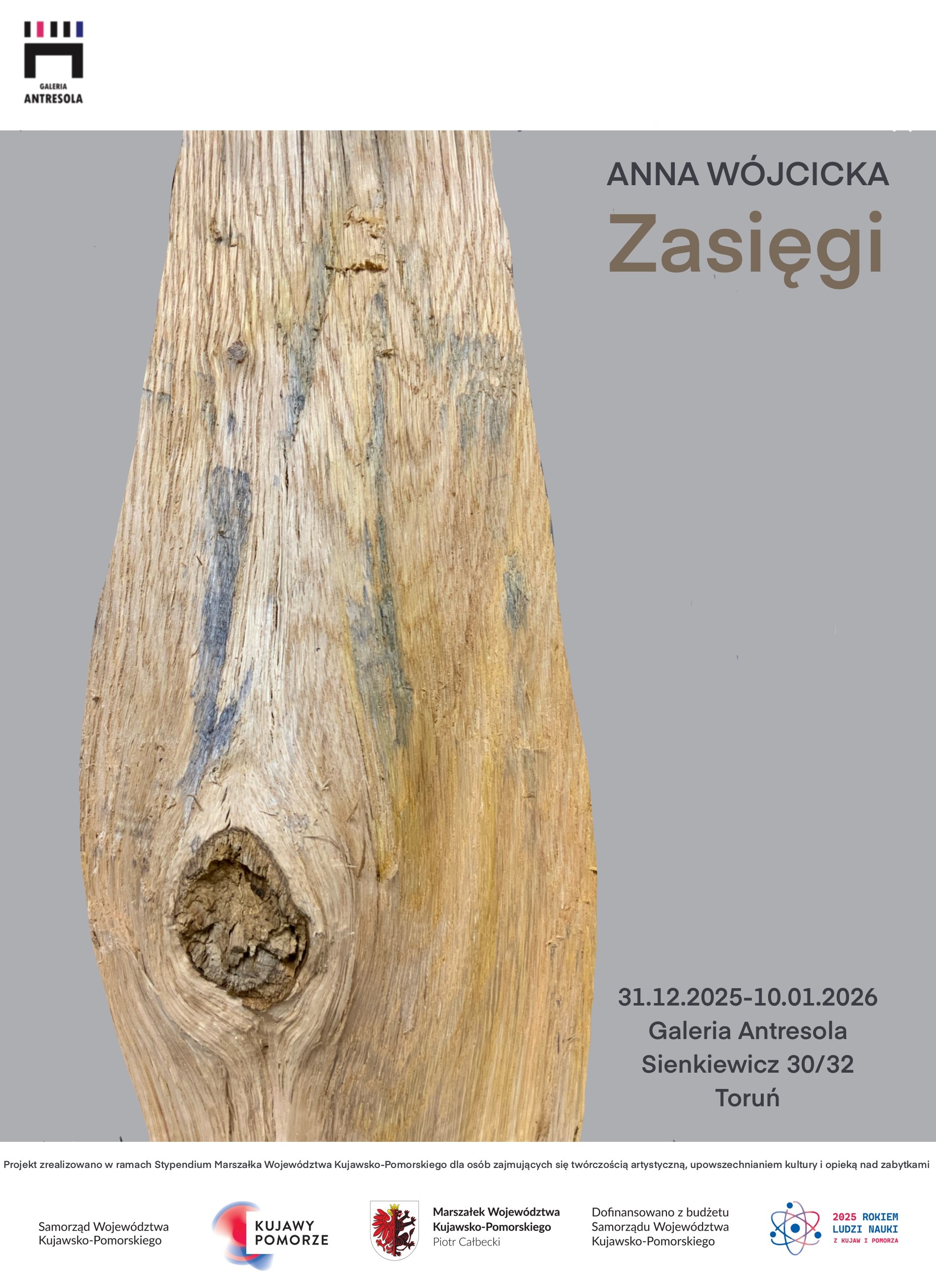 Prezentowany w Galerii Antresola projekt zrealizowany został w ramach Stypendium Marszałka Województwa Kujawsko-Pomorskiego dla osób zajmujących się twórczością artystyczną, upowszechnianiem kultury i opieką nad zabytkami.